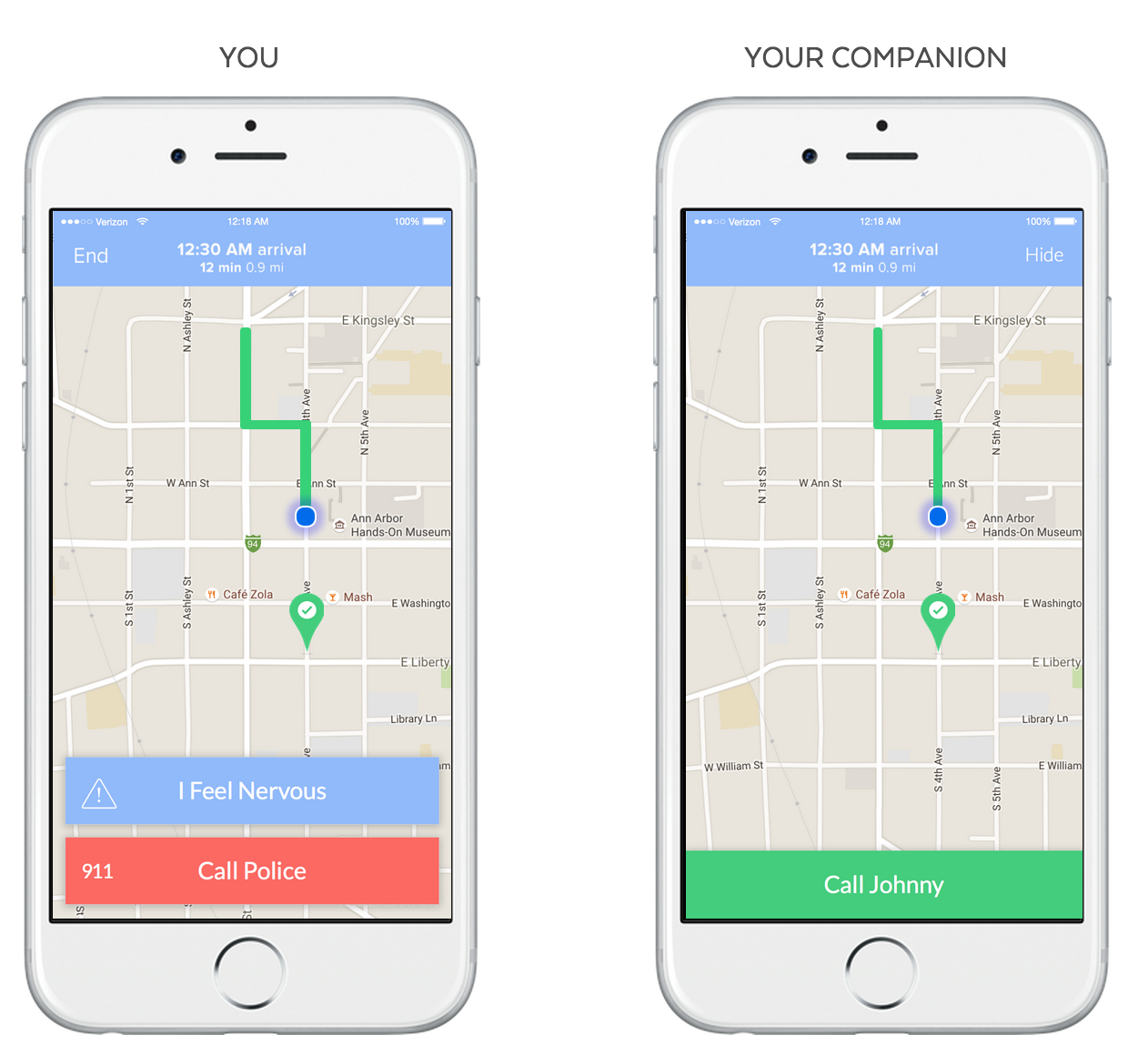 The Companion App is a mobile app that lets you connect with friends to provide you a virtual companion on your walk home. When you are nervous about the area you are walking home in, you just connect to one or more friends via this app and SMS, and then they can follow your progress via GPS. If you stray from the path, or the phone detects you are running or have fallen, it will call the police if you don’t confirm to the app that you are ok.