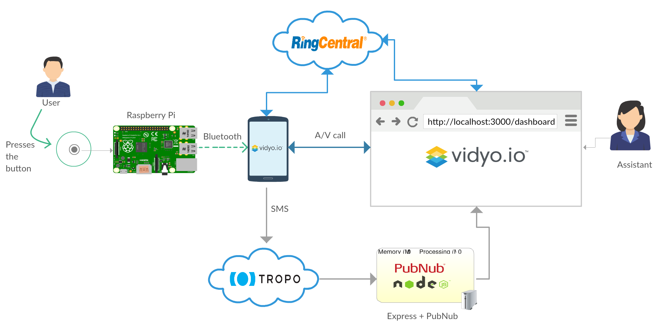 - Once the Android app that we built receives the signal, a webRTC video call starts automatically with an Agent using the Vidyo.io android SDK. The Agent uses a web client and assists the user during the two way voice and video communication using the Vidyo.io JS SDK.