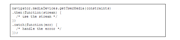 getUserMedia() returns a Promise and we can add a handler to make our magic with the stream or with the error if something goes wrong. The interesting thing here is how the stream is obtained, which is defined on the constraints variable passed as parameter to the API.