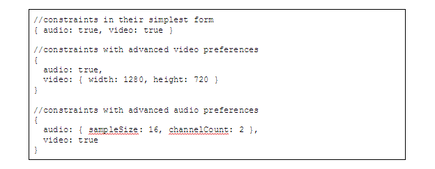 As you can see, we have two variables – one for audio and the other one for video. Each one can have one of two values: a boolean or an object with specific constraints.