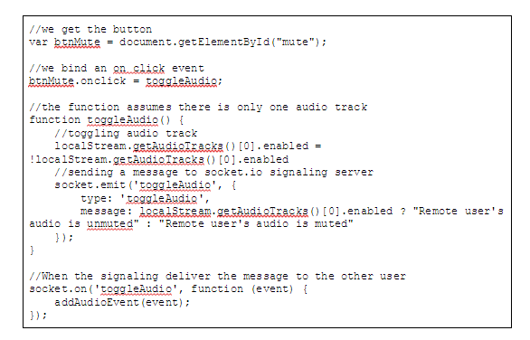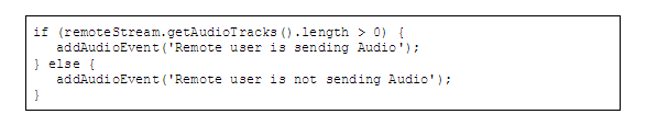 The stream provides a method for both types of tracks, the one for audio is the getAudioTracks() that will return an array of all the audio tracks that the stream has. So in order to make sure a user is actually sending audio we could easily evaluate the content of the array, because if something happened and audio constraint was set false then the stream won’t have any audio track and the method would return an empty array. Consider something like this: