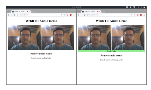 Notice that we have two buttons for calling. Go ahead and initiate a call on which one user will not send any audio and the other one will do. Open two tabs, preferably put them side by side and click “Video only” on one and “Video and Audio” on the other. See the magic happen: