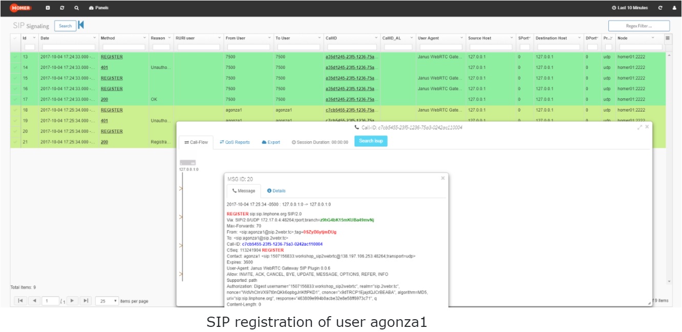 Once there we will be able to monitor all the transactions going through the Janus Gateway: calls, registrations or other.