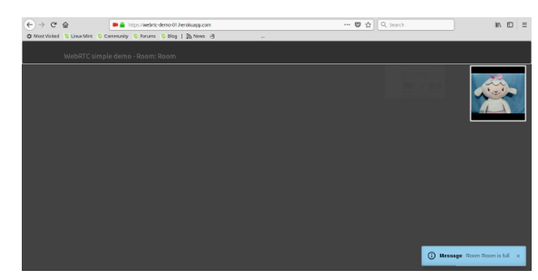 The WebSocket is responsible for validating that each call accepts a maximum of 2 active members; therefore, a third party will receive a rejection message and the communication will not be established. See example below.