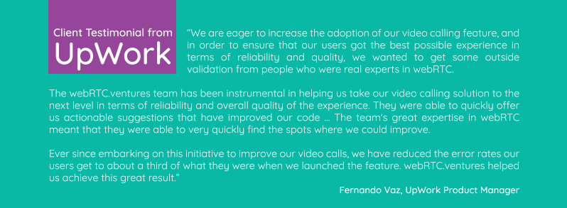 We recently performed an assessment for UpWork, the premiere freelancing platform, and helped them reduce WebRTC error rates by 70% on the video calls performed on their job platform!