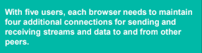 Now, let’s see what this would look like if we add a few more peers. As the number of users keep increasing, the processing and bandwidth consumption becomes excessive, and this is more visible on mobile devices or in low-end spec computers, where resources are more limited, and on broadband connections, which are usually ties to contracts where a monthly limit of usage is specified.