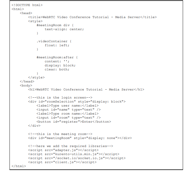 To begin with, we need to create an html file with two divs, one for the login screen and the other for the actual call. Also, we will add the kurento-utils library which requires the adapter.js script and the already known socket.io client library and client.js file.