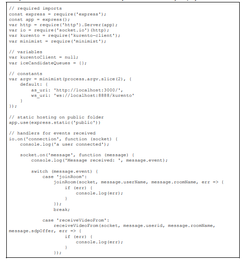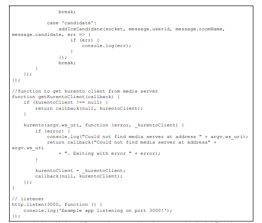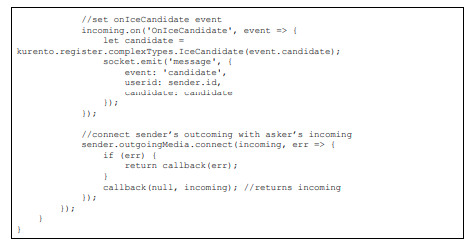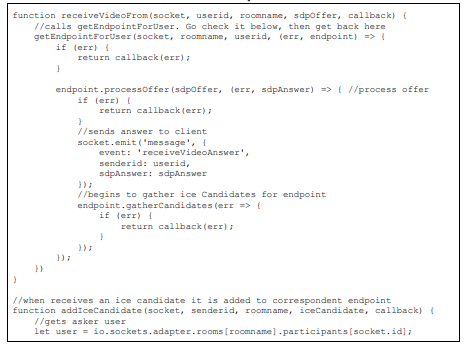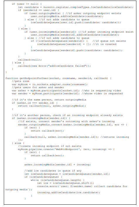 On the server side the ‘receiveVideoFrom’ and ‘candidate’ events are handled by the receiveVideoFrom and addIceCandidate functions. A third function called getEndpointForUser is also used to retrieve the Kurento WebRTC Endpoints associated with each user.