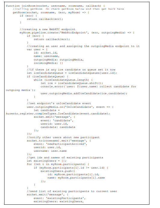 Returning to the joinRoom function, after we get the room we create a Kurento WebRTC Endpoint which is assigned to the user. Then if there is any ice candidate on queue for the endpoint, it is added to it by calling the endpoint’s addIceCandidate function, then we set its onIceCandidate event.