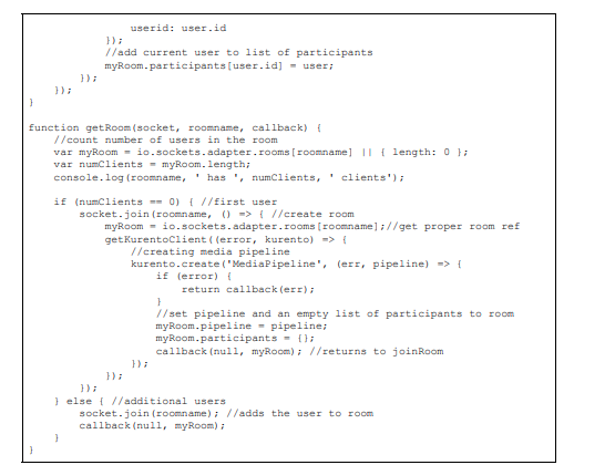 We end the function by sending two messages: one for the other users in the room notifying them about the new participant and another one for the current user with the list of existing participants. Add the mentioned functions to server.js as follows.