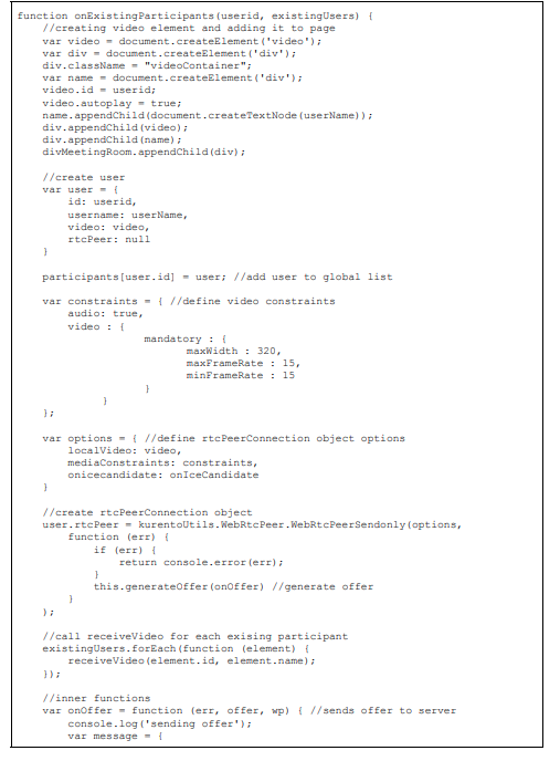 On the client side, two functions are in charge of handling the ‘newParticipantArrived’ and ‘existingParticipants’ events sent by the server, these are receiveVideo and onExistingParticipants.