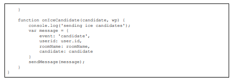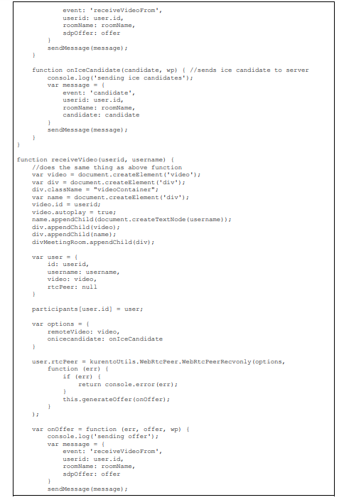 Each function has their own pair of inner functions for onOffer and onIceCandidate events which are triggered by the rtcPeer object, they’re in charge of sending the actual offer and ice candidates to the server when ready, sending the ‘receiveVideoFrom’ and ‘candidate’ messages respectively. Add code below to client.js.