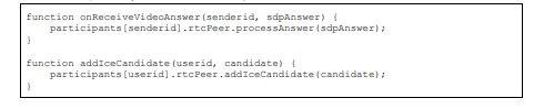Then on the client side we need to handle the ‘receiveVideoAnswer’ and ‘candidates’ events emitted by the server, this is done using the onReceiveVideoAnswer and addIceCandidate functions respectively. Add them to client.js file.