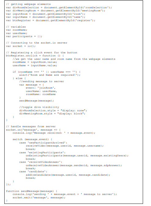 Cool. Now let’s create the client side javascript file. We begin by getting a reference of the webpage elements and declaring variables for client’s username and room name, we also declare a variable for storing a list of the call participants. Then, as was the case in the one-to-one version of the application, we connect to the signaling server using socket.io and register a click event to the button for sending the first message to the server, which is a ‘joinRoom’ message. This time we don’t use the socket.emit() function directly, instead we use an utility function sendMessage() defined at the bottom of the file. We also need to declares handlers for server messages.