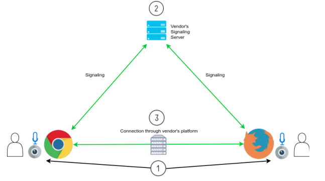 As you can see, servers are still there: Signaling, STUN, TURN and media server are all there, only that this time they’re part of a service offered by a third party vendor.