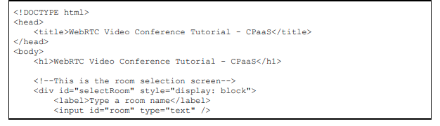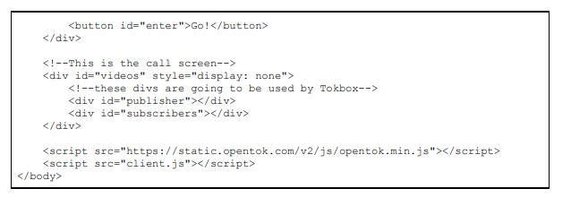 Now, let’s create a simple html file with two divs: selectRoom and videos. The first one will show a screen to type a room name for the call and the other is where the actual call takes place. Inside the videos div, we will create another pair of divs: publisher and subscribers, those are going be used by tokbox to append the video elements of each call participant. We will also add the opentok library and our client.js script before the <body> closing tag.