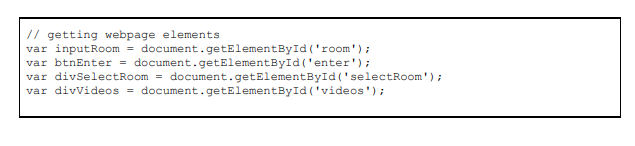 We will begin the client.js file by getting references to webpage elements and declaring some variables, among these are apiKey, sessionId and token variables, which are used by the opentok library to connect with the tokbox platform in order to initiate or join to a call. We also declare a variable to store the room name and our Node.JS server URL.