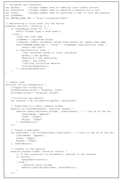 Continuing with our client.js file, when the user clicks the Go button to initiate the call we use the fetch function to make a request to a route defined on our server. The server returns a JSON response with the values for the three tokbox variables. After we set these values we call the initializeSession function.