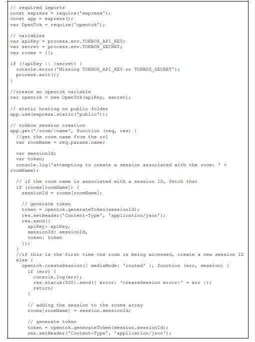 If there is no entry with that name on the rooms array, then the server creates one and stores it in the aforementioned variable, from there it does the same procedure described above. When the client gets the three variables it can connect directly with the tokbox platform to initiate or join to the call. Create the server.js file and paste the code below