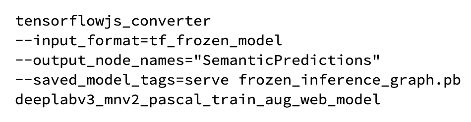 Special recognition to Aleksandar for his post, which is where I learned how to find DeepLab model input and output node names and got the code snippet to do tensorflow semantic segmentation using JavaScript.