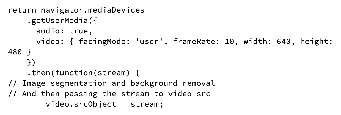 Now we can use gUM to get the user video and create a video copy as a canvas. We will modify that canvas and mask its background.