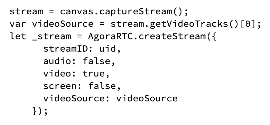 Agora SDK has a createStream function that will call gUM and pass the media automatically. We need to modify the media before sending it out. To do this, we use: