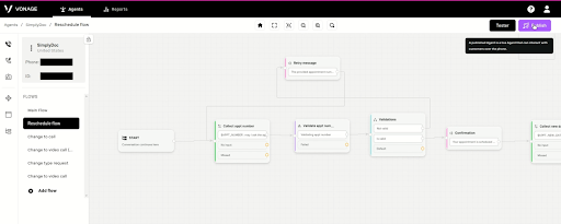 In the Vonage AI Studio, you start out by setting up an Agent, which is the phone number and/or chatbot that you are working with. Each agent can have multiple workflows associated with it. In our sample, SimplyDoc Agent we will be working with a flow that we have named “Reschedule Flow.” As the name indicates, this flow is for when a patient calls into a phone number to reschedule their appointment. The workflow dashboard looks similar to the following: