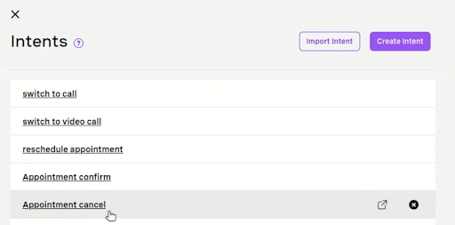 Second, it’s also interesting to see how the voice recognition aspect of the AI Studio works. Whenever our patient is going to talk to the bot, that is called an Intention. The Intention indicates the “intent” of why the patient is speaking to the bot. For example, in the screenshot below, the patient is answering the first question of the phone call, where the bot asks the patient what they want to do. Our bot has been configured to allow multiple intents, such as switching their telehealth visit from a video call to a phone call.