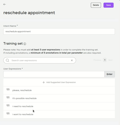 Rescheduling the telehealth visit is one of those intents, and the one we’ve been focusing on in this blog post. So, we need to “train” the bot to understand what our patient might say when they want to reschedule an appointment. Ricardo has configured that in the screenshot below by entering in typical phrases that a patient might say, such as “I need to reschedule my appointment.” The Vonage AI studio converts the patient’s speech to text. This allows the AI to intelligently match that text to one of the Intents that has been configured.