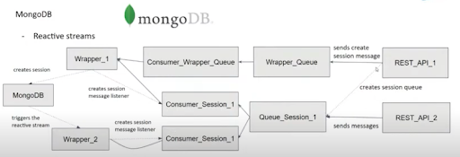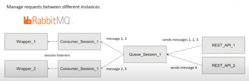 When we create a session, a message is sent from the client to the REST API. It will create the session queue and send the message to the Wrapper queue. But only a single instance will receive the session creation message. It will create a session message listener and then insert the new session to the mongo database.