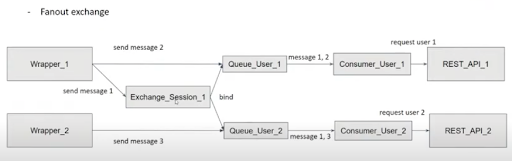 With fanout exchange, we can also send a message to multiple queues. This allows us to send the same message to multiple user queues at once by binding the user queues to the session exchange. All the user queues will consume that message.