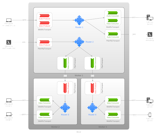 - Workers are a single CPU thread C++ subprocess that MediaSoup is responsible for. They can include multiple routers, which behaves as an SFU and is responsible for the media transfer between consumers and producers.