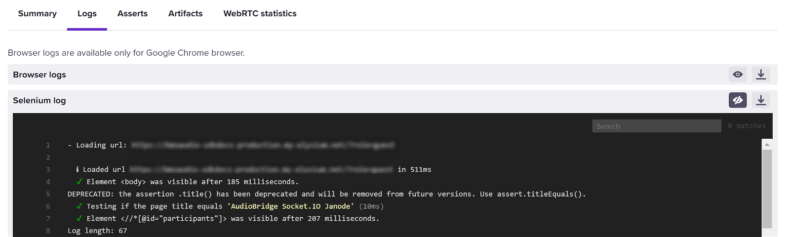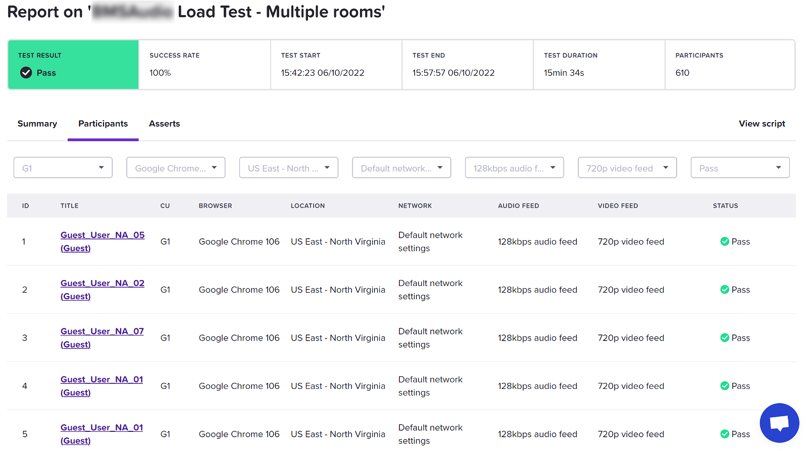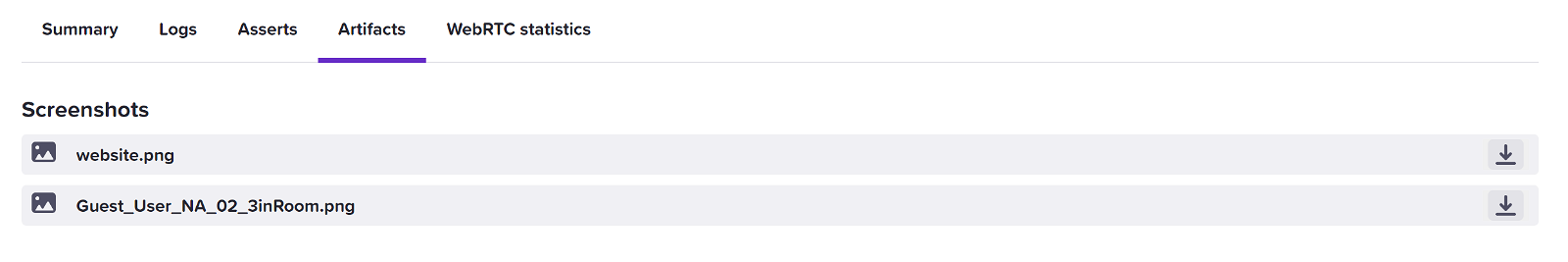 The report also lets you view results per participant. It lists the participants and their attributes with a status in the last column. You can click on any participant to view their individual statistics during the session. It also has sections to check for logs if added in the test script, artifacts such as screenshots and more WebRTC statistics in detail.