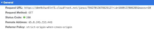 This tells you that the request was made to the CloudFront distribution (remember we said it is acting as the entrypoint) at the ‘/janus’ endpoint, which is where the Janus server’s REST API is available.