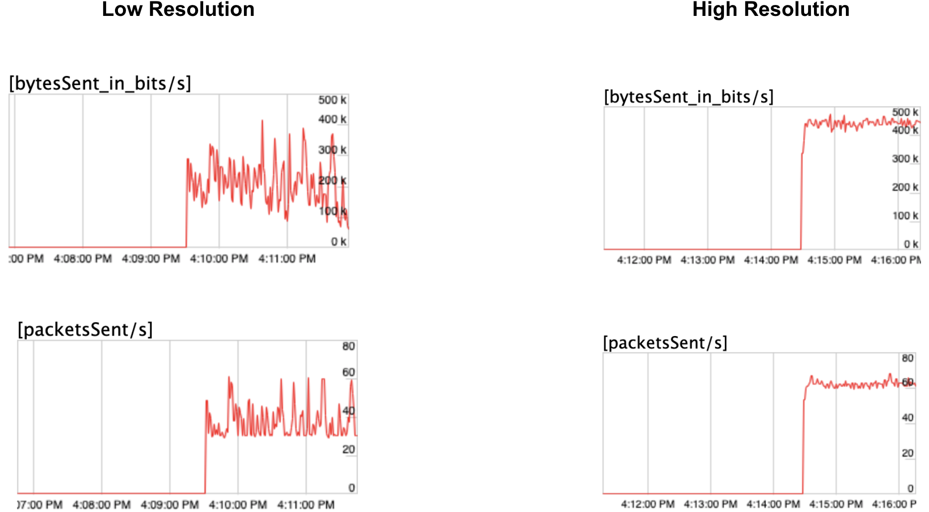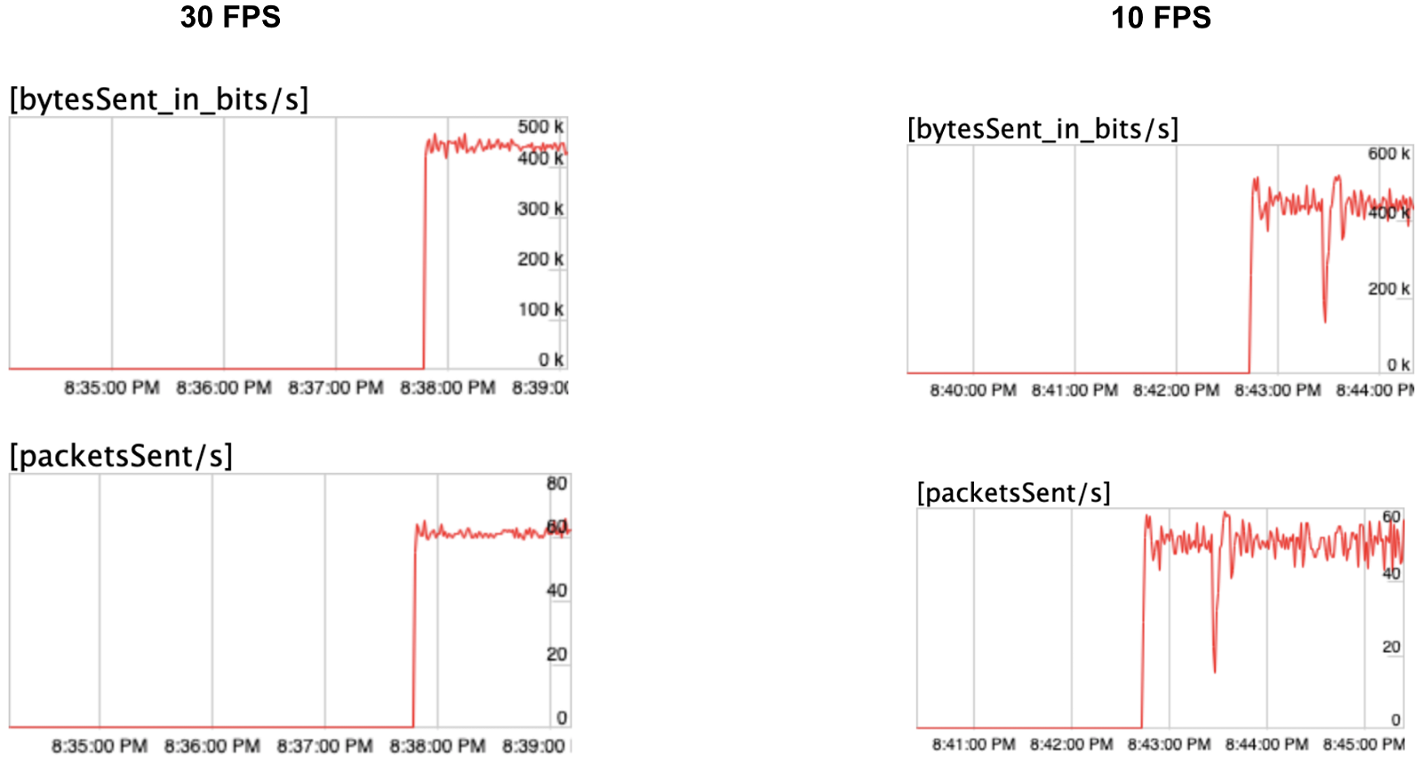 You can see the network bandwidth difference between a stream at 320 x 240 (low res) and a stream at 1280 x 720 (high res). At lower resolution, the bitrate has high variance. But on average, it has almost half the bitrate when compared to high resolution.