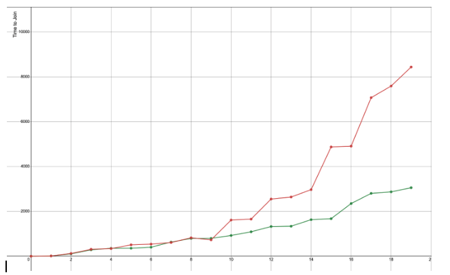 As you can see, up until the 8th participant we see no major improvement in load time with this method. After the 8th participant, we see a significant improvement.
