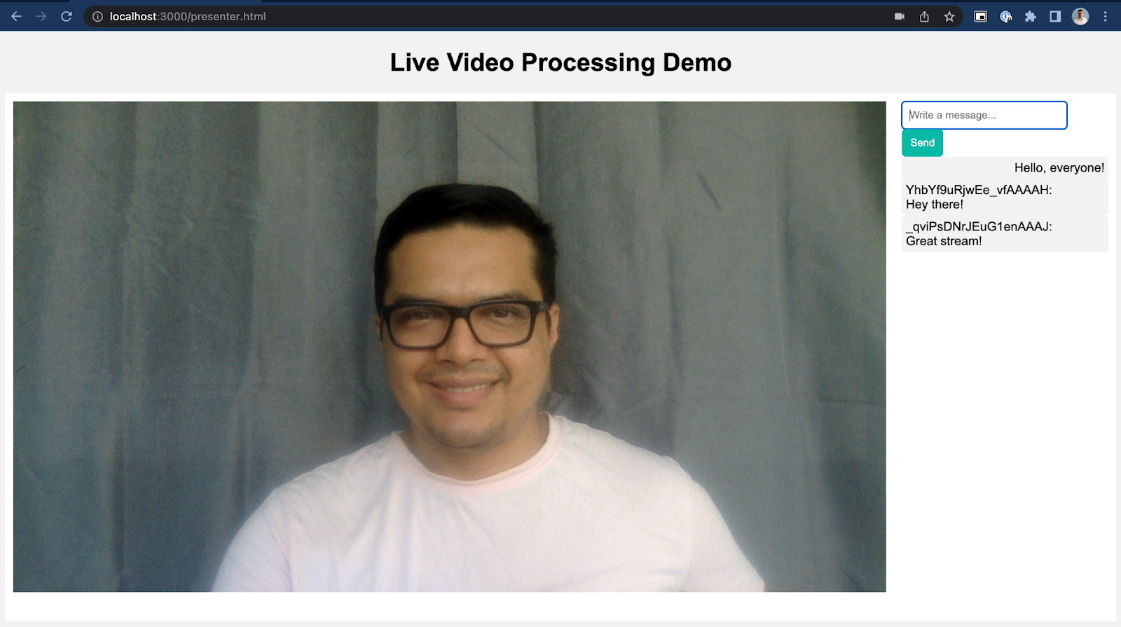 Next, open http://localhost:3000/presenter.html in your favorite web browser. Then, open a couple more browser tabs and navigate to http://localhost:3000/viewer.html. You’ll see a user broadcasting his/her video streams and a couple of other users viewing it.