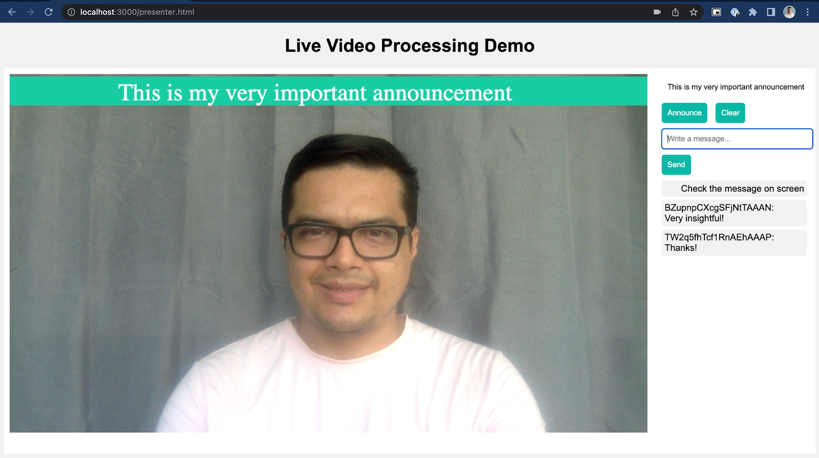 To make it more interesting, let’s add a way for a presenter to display text announcements over the video. To do so, we will create a new transform function factory that sets up the necessary components and provides the required transform function.