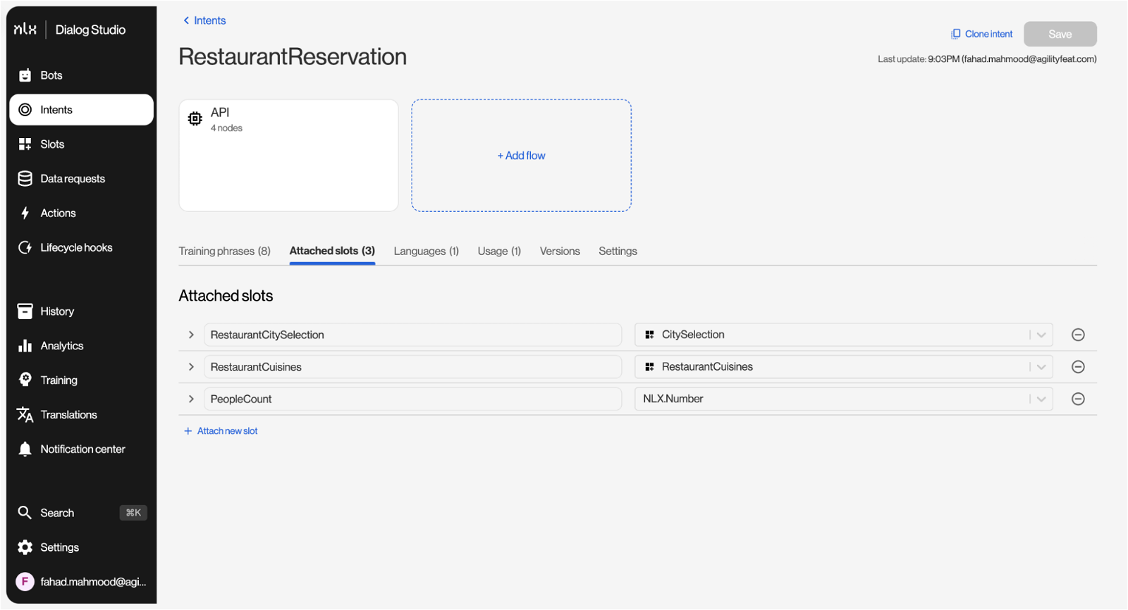 Let’s create another data slot to know the number of diners. This time, we don’t create a custom data slot. Instead, we go back to the “Attached slots” tab from the intent, attach a new slot with the name “PeopleCount” and “NLX.Number” from the dropdown as the Data Slot type.
