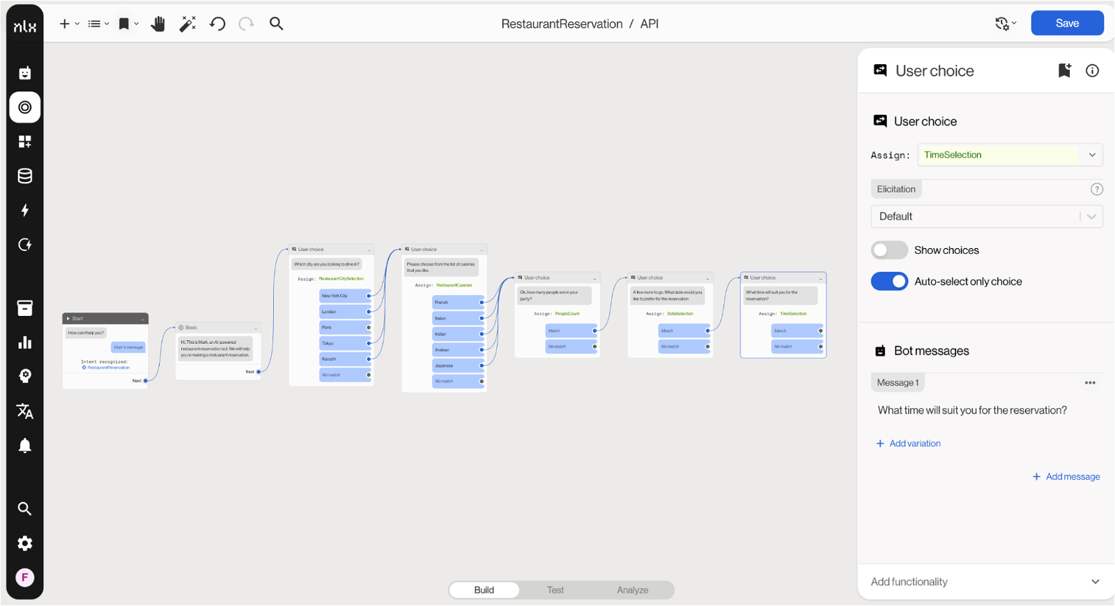 Similarly, add “What time will suit you for the reservation?” and assign the “TimeSelection” data slot.