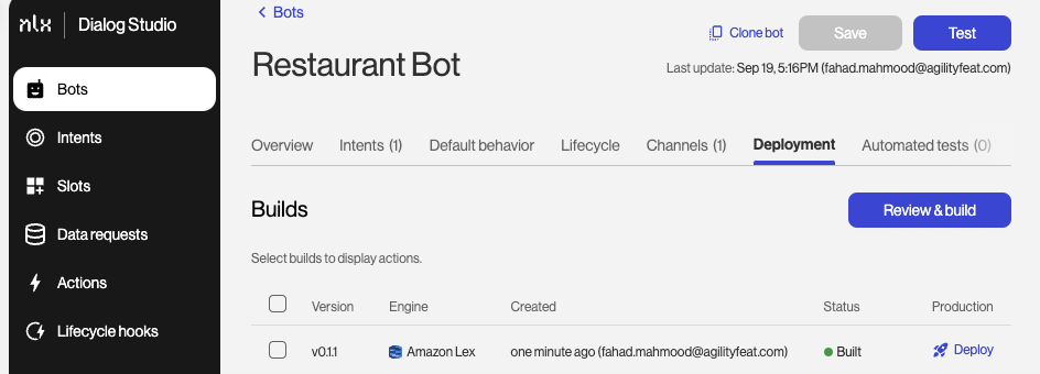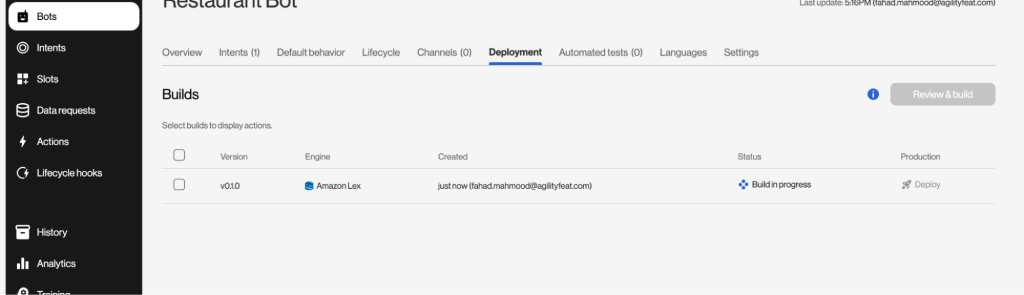 Open the Deployment tab in the “RestaurantBot” screen. Since it’s our first time deploying the bot, we will see a “Create your first build” button. Click on it, set the version name, select an NLP engine like Amazon Lex, and finally click on “Create Build”.