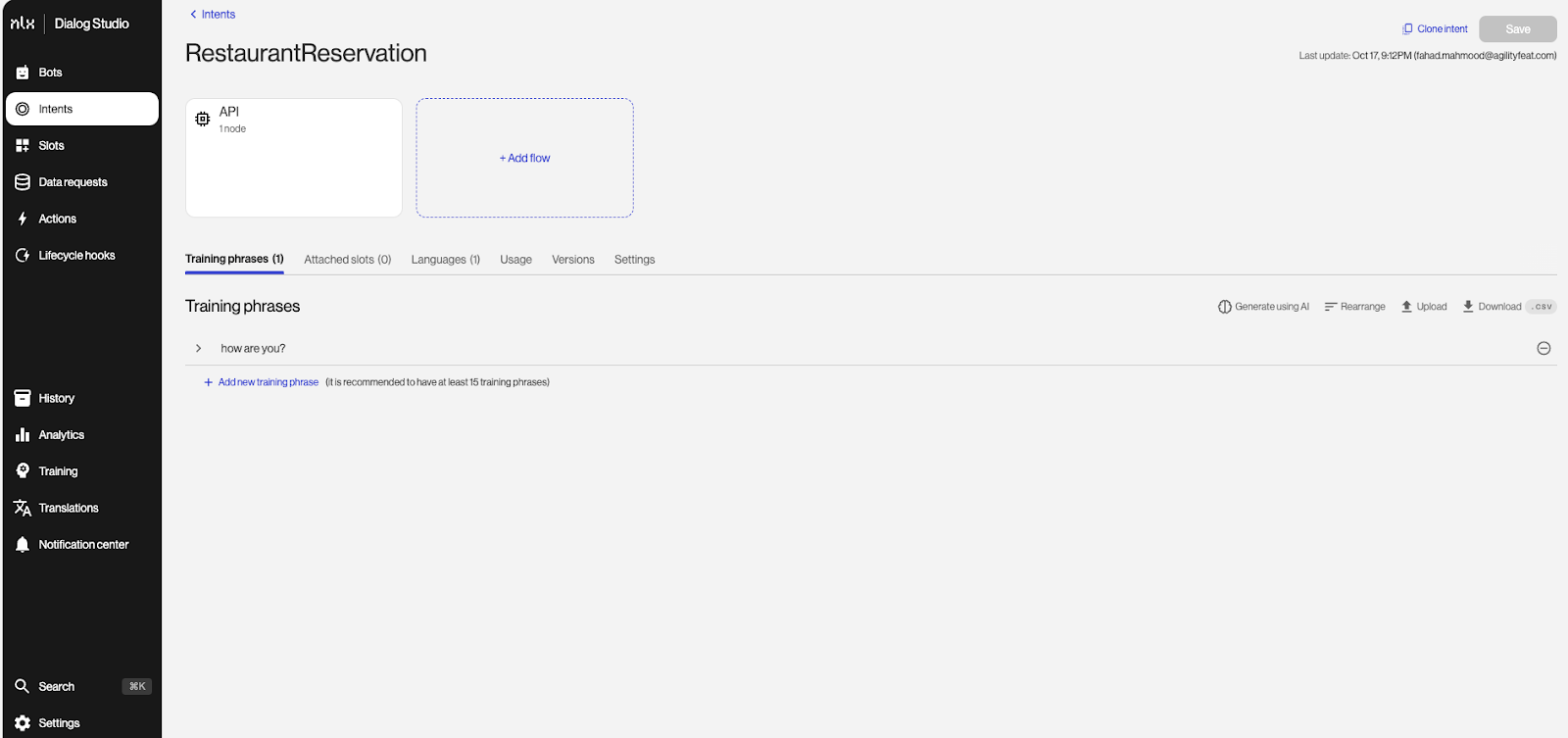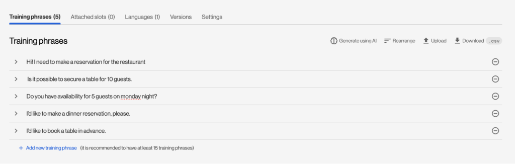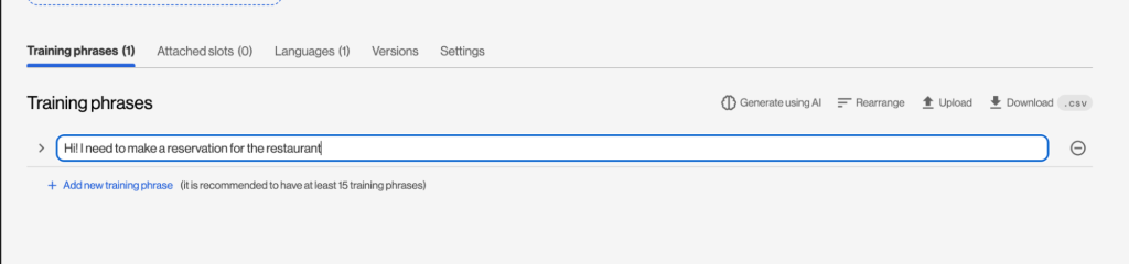 It is recommended to add at least 15 training phrases related to each intent. Can’t think of any? Click “Generate Using AI” and you’ll get some help!