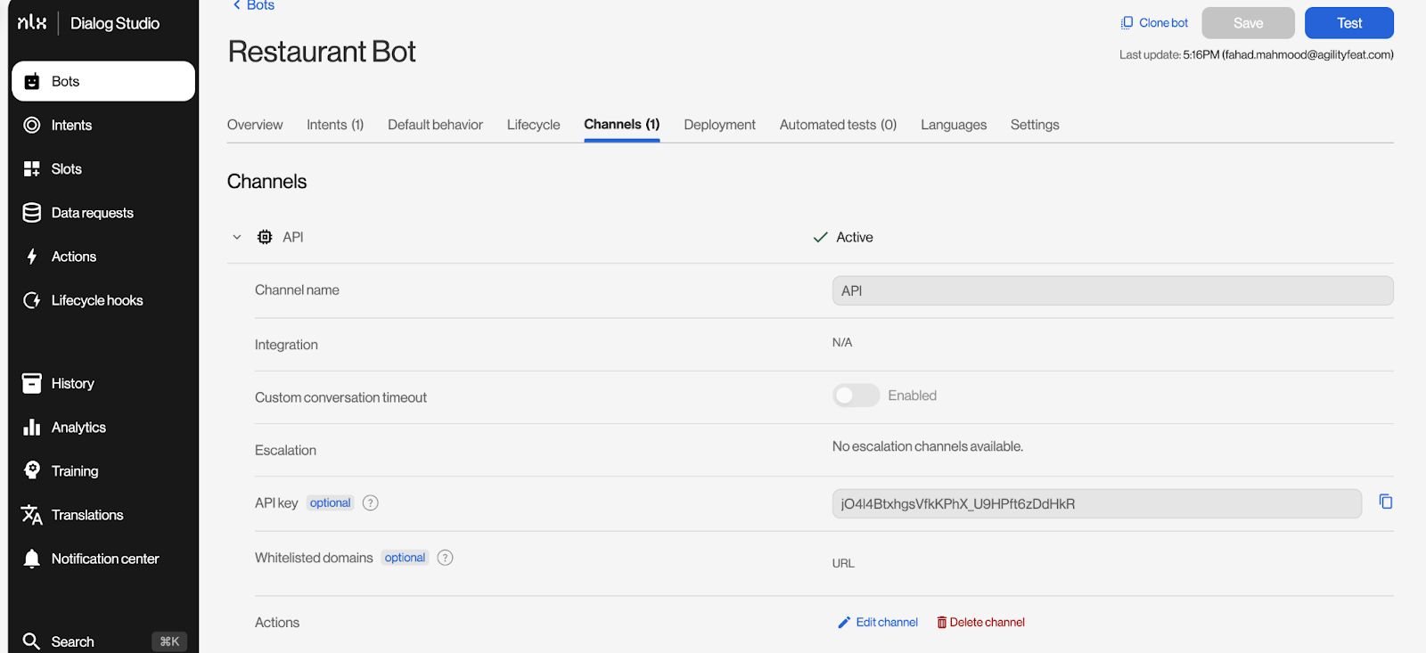 Channels are modes through which users can connect with the bot for communication. The default channel is API channel, and that’s the one we are going to add to our bot.