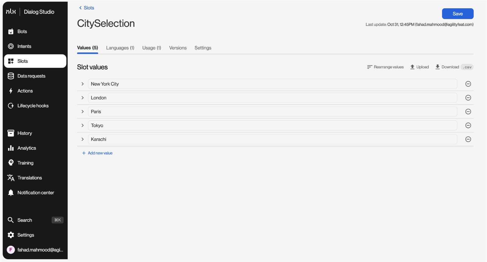 ), then “Add Slot”, and type “CitySelection” as the slot name. In the values section, click on “Add new value” and add a fixed list of cities.