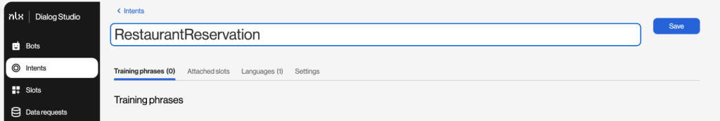 In the “Intents” screen at the left, click “Add Intent”, input RestaurantReservation as its name, and click “Save”.