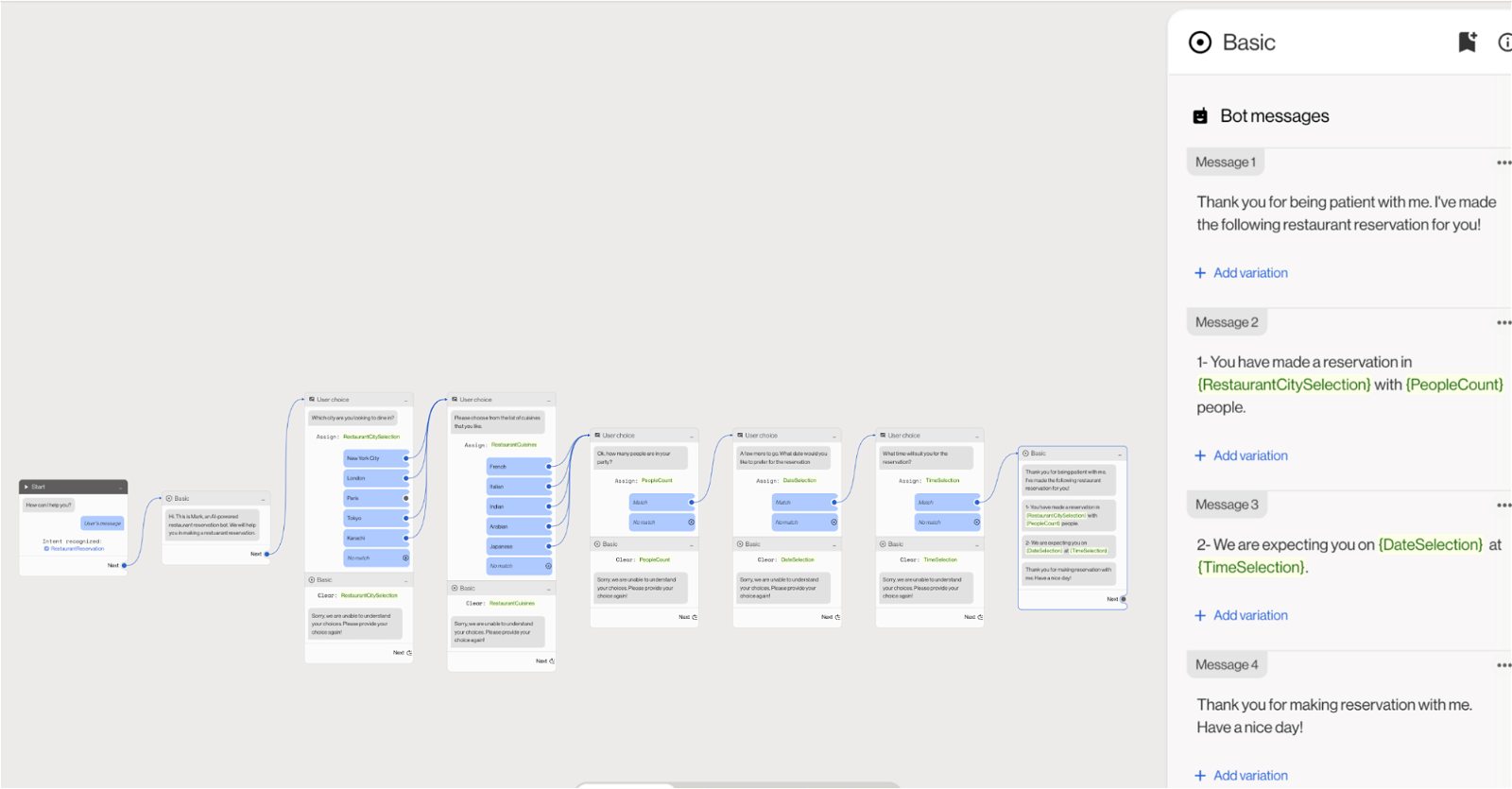 It’s time to show a reservation confirmation message. We also want to show the users inputs that the bot has collected from the customer. We attach a “Basic” node in our conversation canvas and connect it with the last “User Choice” node. Then we add multiple messages to this node. The first message is: “Thank you for being patient with me. I’ve made the following restaurant reservation for you!”