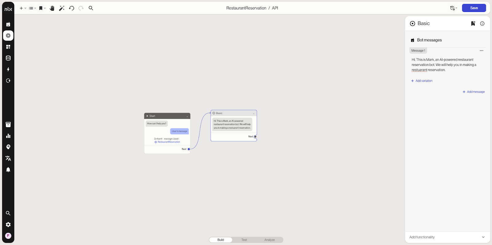Let’s set a greeting message by clicking “Add Message”: “Hi. This is Mark, an AI-powered restaurant reservation bot. I will help you in making a restaurant reservation.”