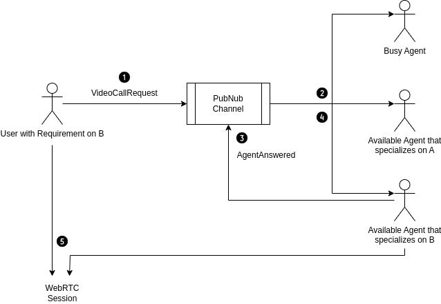 First, we set up a waiting queue using a PubNub channel. Users that want to speak with an agent send a message to the channel. Agents ‘listen’ for such messages and if one decides to take the call, he/she notifies the channel so that all other users know that the call is taken.
