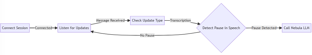 In our case, we are only interested in the transcriptions and then we are calling Nebula LLM only when we detect a pause in speech from the user for a specific number of milliseconds.
