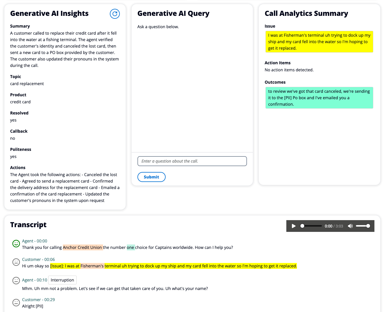 Amazon Transcribe is a generative AI-powered API for generating highly accurate call transcripts and extracting conversation insights. It supports transcribing over 100 languages both in batch and in real-time. It even works with those low-fidelity phone audio inputs that are common in many contact centers!